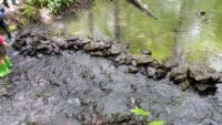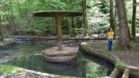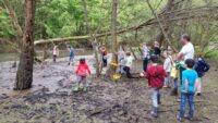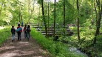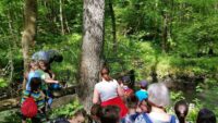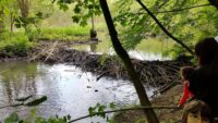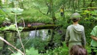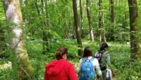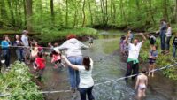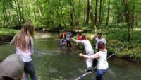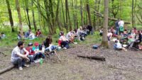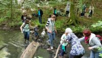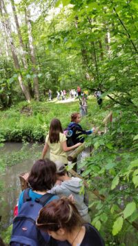Am Samstagmorgen, den 21. Mai 2016, trafen sich Kinder, Eltern und Lehrkräfte der Klasse 2.1, um entlang des Fischbachs zu den Überresten des ehemaligen Fischbachbades zu gelangen. Der Weg führte uns abseits der üblichen Waldwege über umgefallene Baumstämme und Äste, vorbei an duftenden Bärlauchfeldern, hin zu einem eindrucksvollen Biberdamm, bevor wir dann am Badepilz des Fischbachbades eine Rast einlegten.