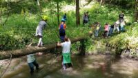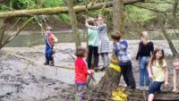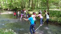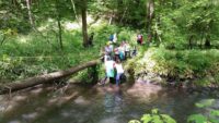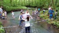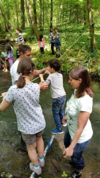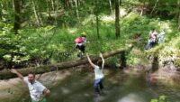 Höhepunkt war jedoch sicher das erlebnispädagogische Programm: es galt auf einem schmalen Baumstamm zu balancieren, einen modrigen Tümpel nur an einem Seil hängend zu überqueren und eine kleine Insel im Fischbach über eine Slackline zu erreichen.