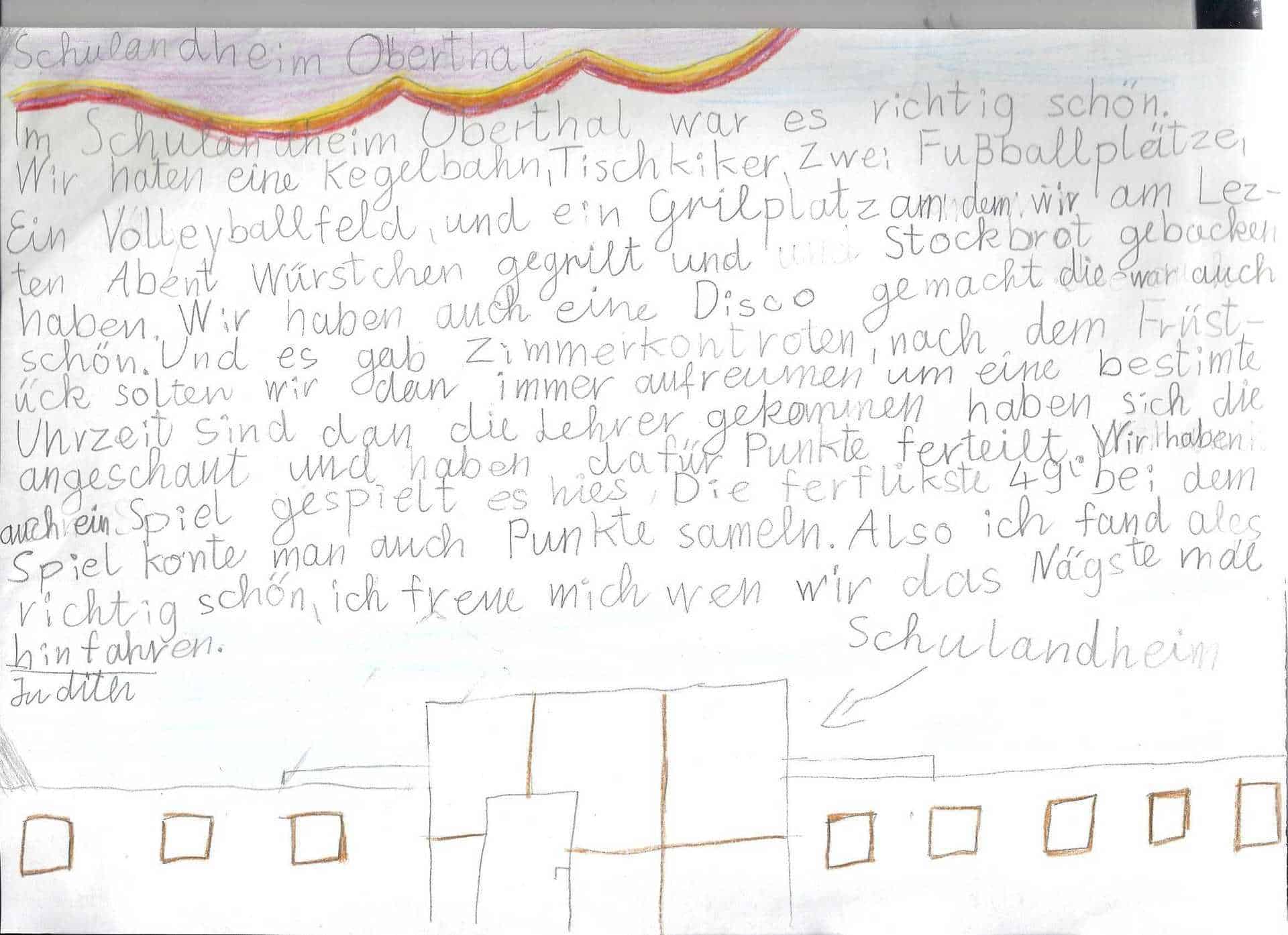 Das Schullandheim Oberthal ist sehr schön. Es gab 2 Bolzplätze, einen Grillplatz mit Tischen und Bänken und es gab einen Volleyballplatz. Einmal sind wir an einen Bach gegangen und haben Rötel gesammelt. Der Bach hieß Rötelsteinbach. Wir waren kegeln, haben Spiele gespielt und waren sehr viel draußen. Es gab einen Hügel, dort konnte man sich runter rollen lassen. Das Essen war sehr lecker.Anatol