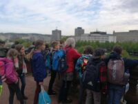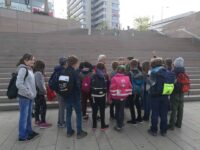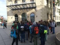 Mit Essen und Trinken ausgerüstet, fuhren wir um 8:00 Uhr mit der Saarbahn zum Hauptbahnhof. Von dort aus ging es zur Bergwerksdirektion, die jetzt Teil der Europagalerie ist. An der Fassade gab es viel über den Bergbau zu entdecken, z. B. die Wappen der ehemaligen Gruben. Nachdem wir „Glück auf“ gesungen hatten (Danke an Frieda und Oscar für die stimmliche Unterstützung!), ging es weiter zur Congresshalle und die Saar entlang zum Salomon-Rülf-Platz.