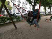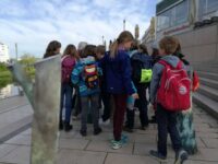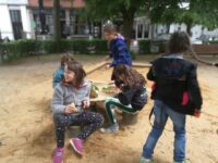 Auf dem Weg zum Spielplatz im Nauwieser Viertel rätselten wir noch über die Bedeutung der Skulpturen am Rathaus und genossen dann unser Essen und die Spielgeräte. Am Landwehrplatz probierten einige Kinder aus, ob sie übers Wasser springen (nicht laufen) können. Dann ging es mit der Saarbahn zurück zur Schule.