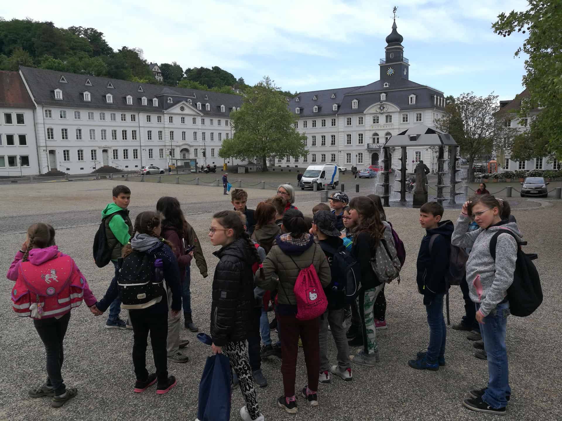 Am Schloss erfreute Jonas seine Mitschülerinnen und Mitschüler mit einer kompletten Geschichte des Schlosses und seiner Gestaltungsmerkmale. Erweitert und vertieft wurde es durch eine Videoinstallation im Eingangsbereich des Schlosses.