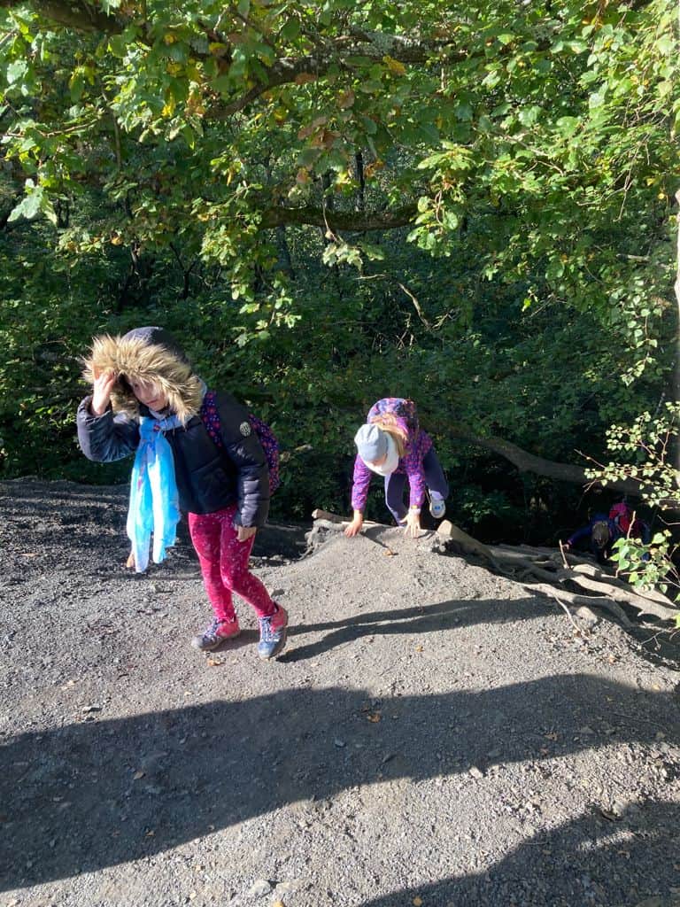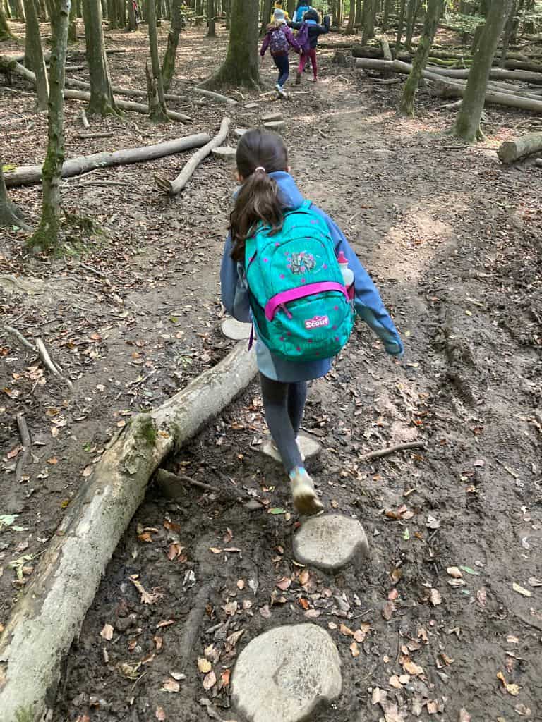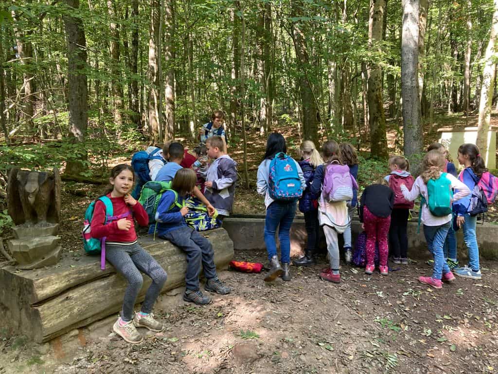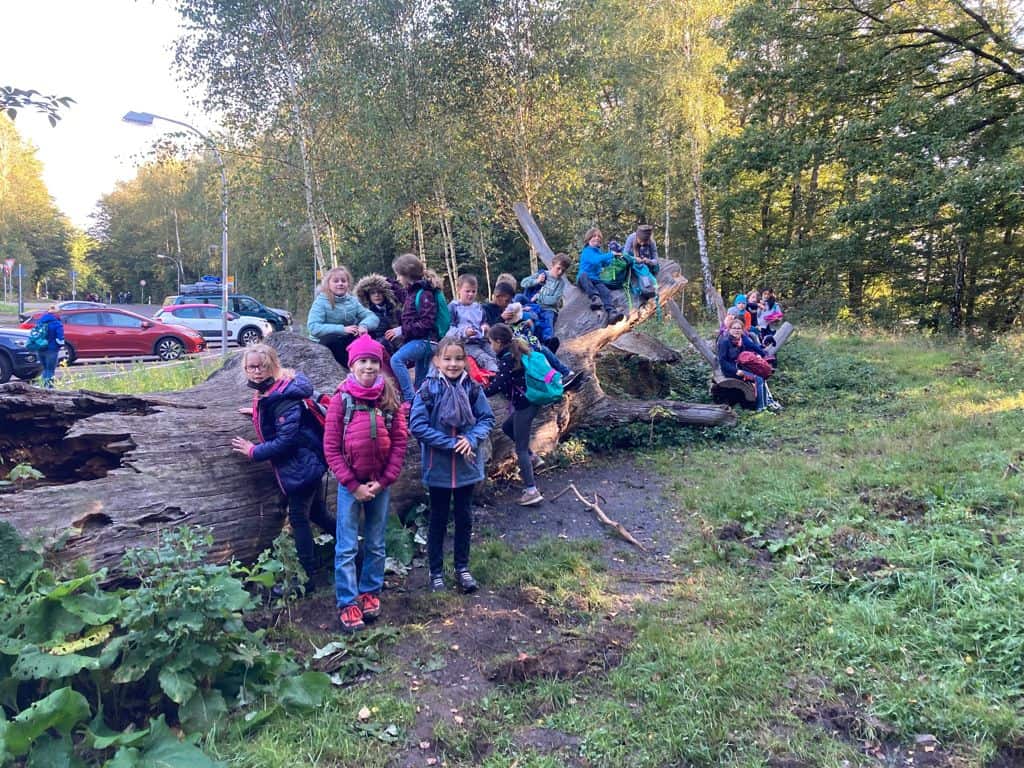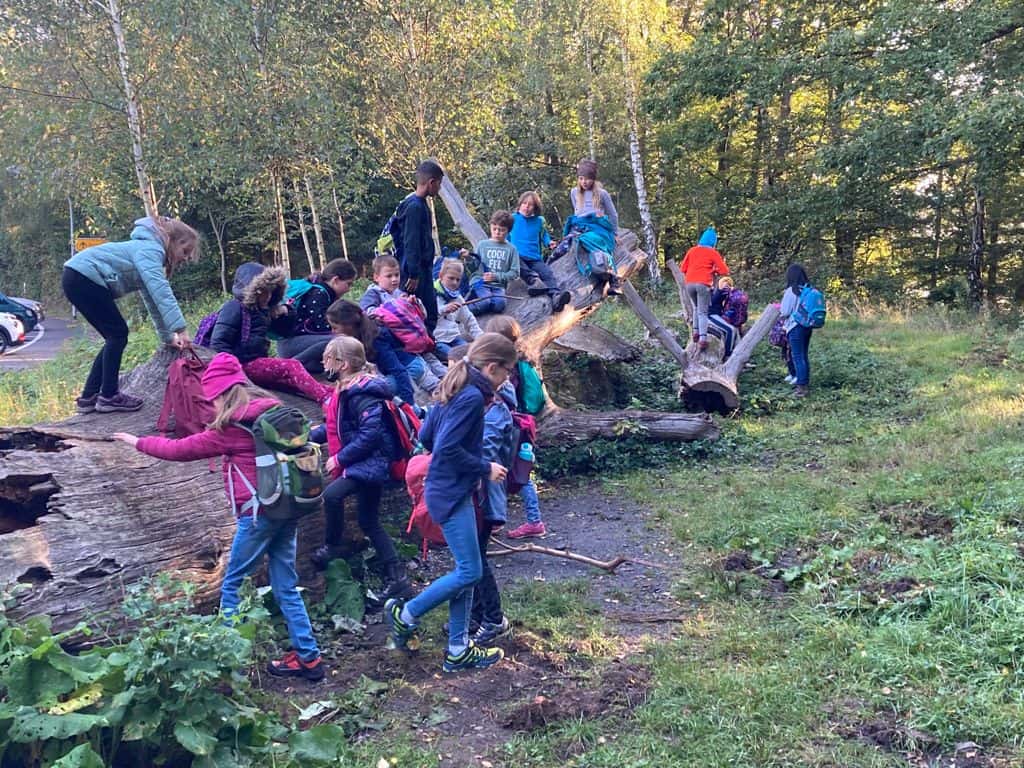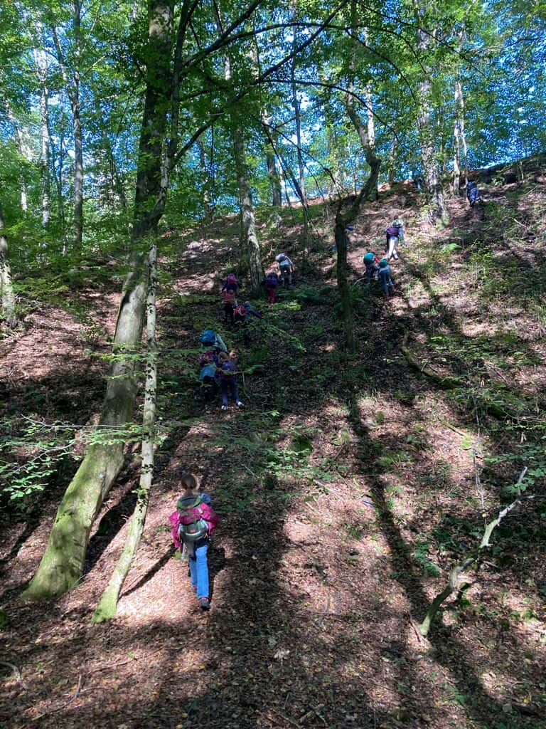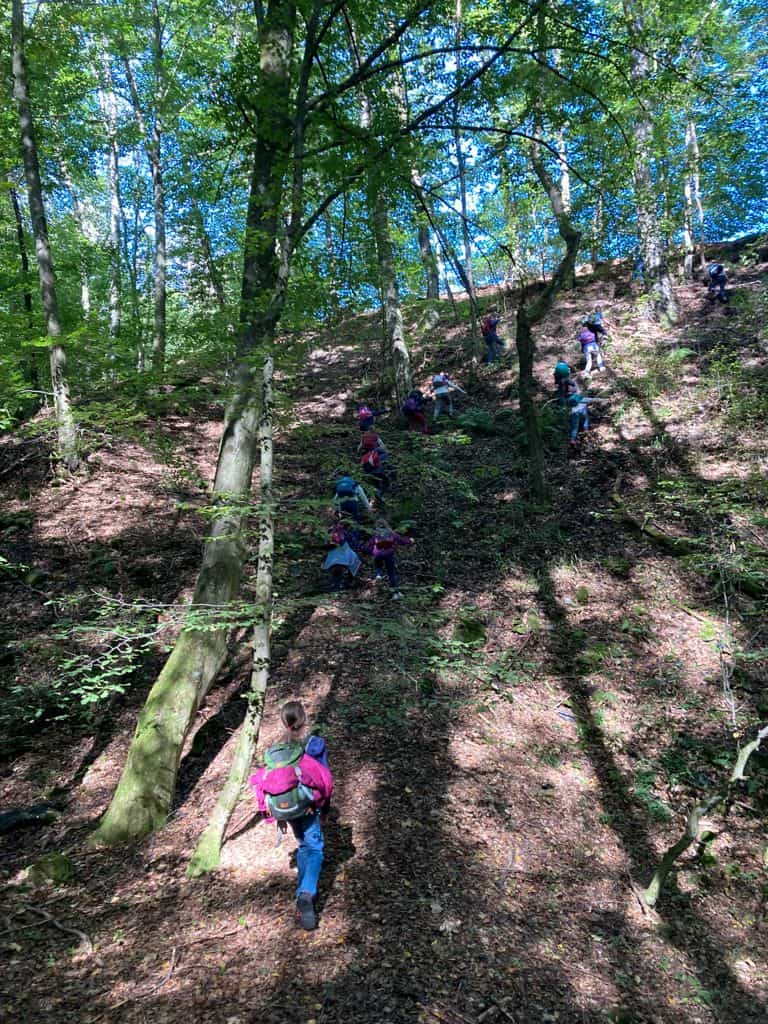 Wir sind zum Wald bis zum Heinrichshausweg gewandert. Dort haben wir zunächst gefrühstückt. Danach kam Silke, die „Urwaldführerin“ und wir sind auf den „Kleinen Fuji“ gegangen. Dort ist ein Kuscheltier hinuntergerollt. Als wir wieder runtergestiegen waren, lag es dort. Kurze Zeit später haben wir gemeinsam ein Ballspiel gespielt. Daraufhin sind wir einen Abhang hochgeklettert. Nun haben wir uns von Silke verabschiedet. Wir kamen wieder an der Schule an. Schließlich wurden wir abgeholt. Helena Schuh